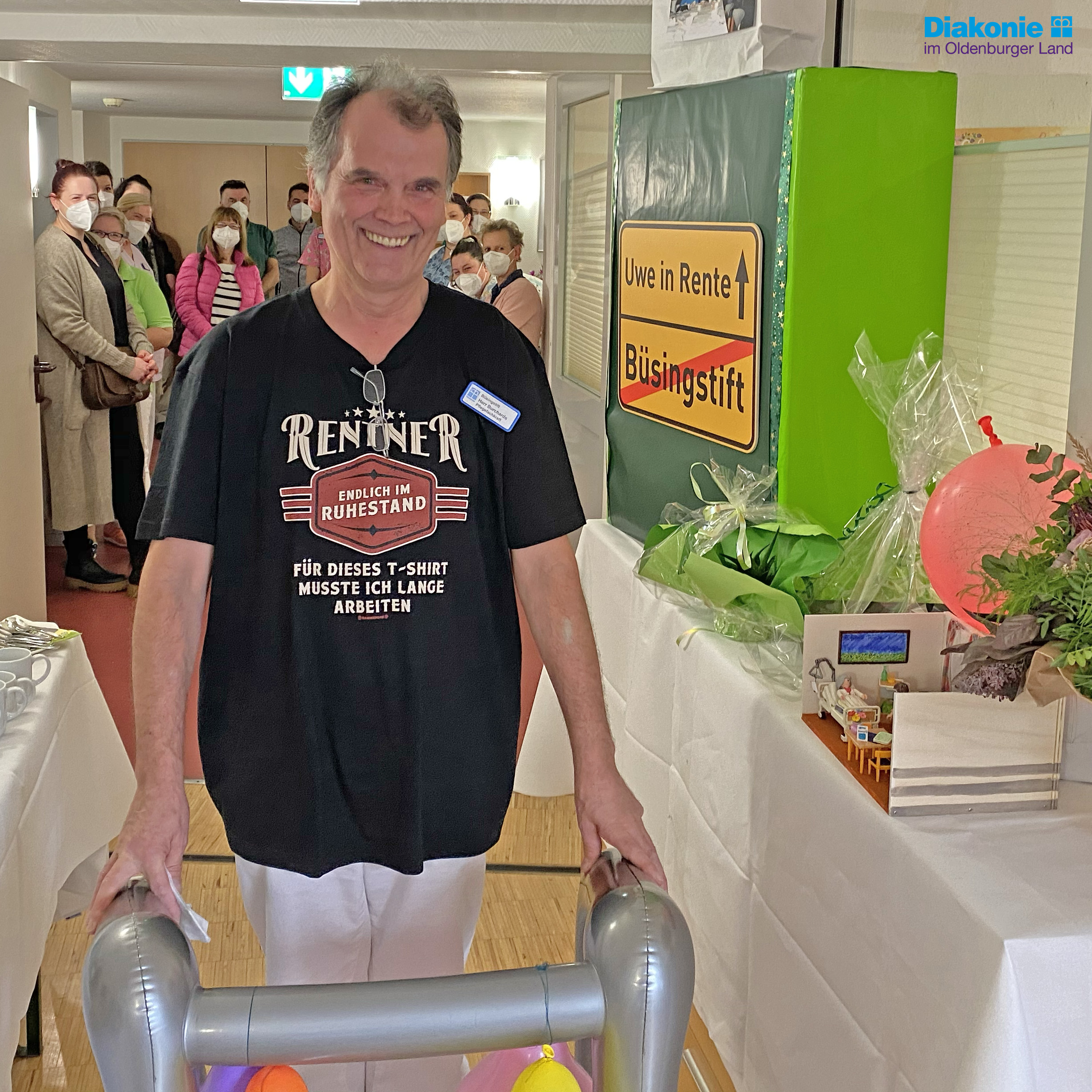 Oldenburg, 30.9.2022 - Uwe Burchards wurde im Büsingstift in Oldenburg von seinen Kolleg*innen mit 64 Jahren in den Ruhestand verabschiedet. Er hat 41 Jahre in der Pflege gearbeitet und ihm ist auch an seinem letzten Arbeitstag die Begeisterung für seinen Beruf anzumerken. „Es war schön hier zu arbeiten und ich hatte tolle Kolleg*innen“, erzählt Burchards. Ins Büsingstift war er zunächst im Jahr 2005 als Krankheitsvertretung gekommen und ist dann 17 Jahre geblieben. „Herr Burchards ist ein absoluter Teamplayer – er wird uns hier fehlen“, sagt Hilke Wulf, Leiterin des Büsingstifts. In seinem Ruhestand möchte er viel Zeit mit seinen fünf Enkeln verbringen und seinen großen Garten pflegen.
